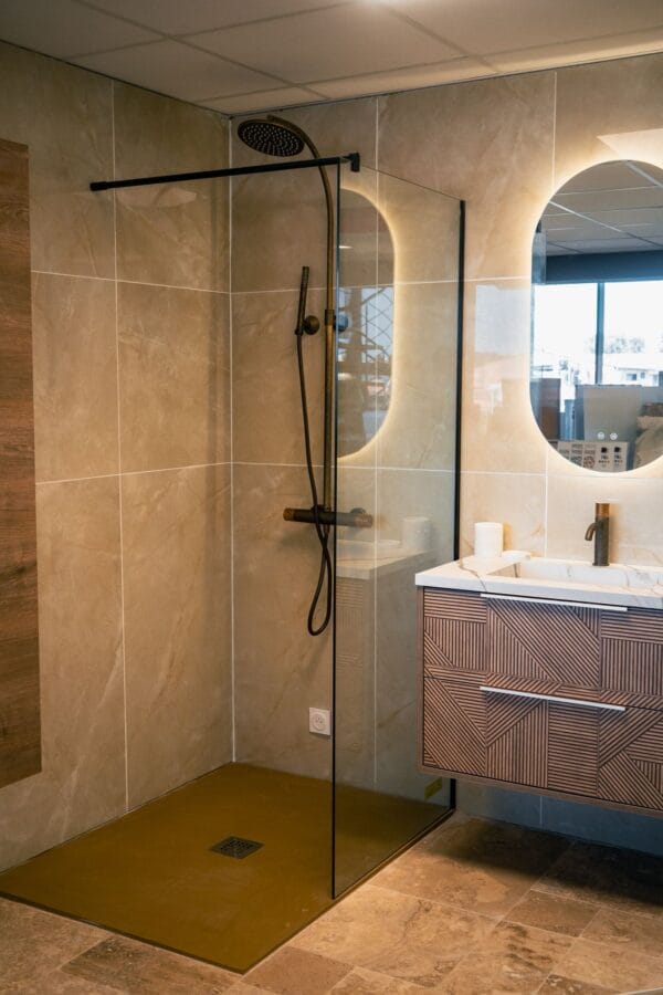 Le receveur couleur moutarde apporte une touche originale et chaleureuse, tandis que les carreaux muraux beige veinés créent un décor moderne et lumineux. La colonne de douche noire, avec sa large tête pluie, assure un confort optimal au quotidien.