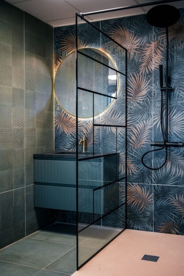 La paroi en verre encadrée de métal noir structure l’espace et apporte un esprit loft très tendance. Le carrelage aux motifs de feuilles, dans les tons bleu/vert et cuivre, crée une ambiance chaleureuse et originale, idéale pour une salle de bain haut de gamme.
