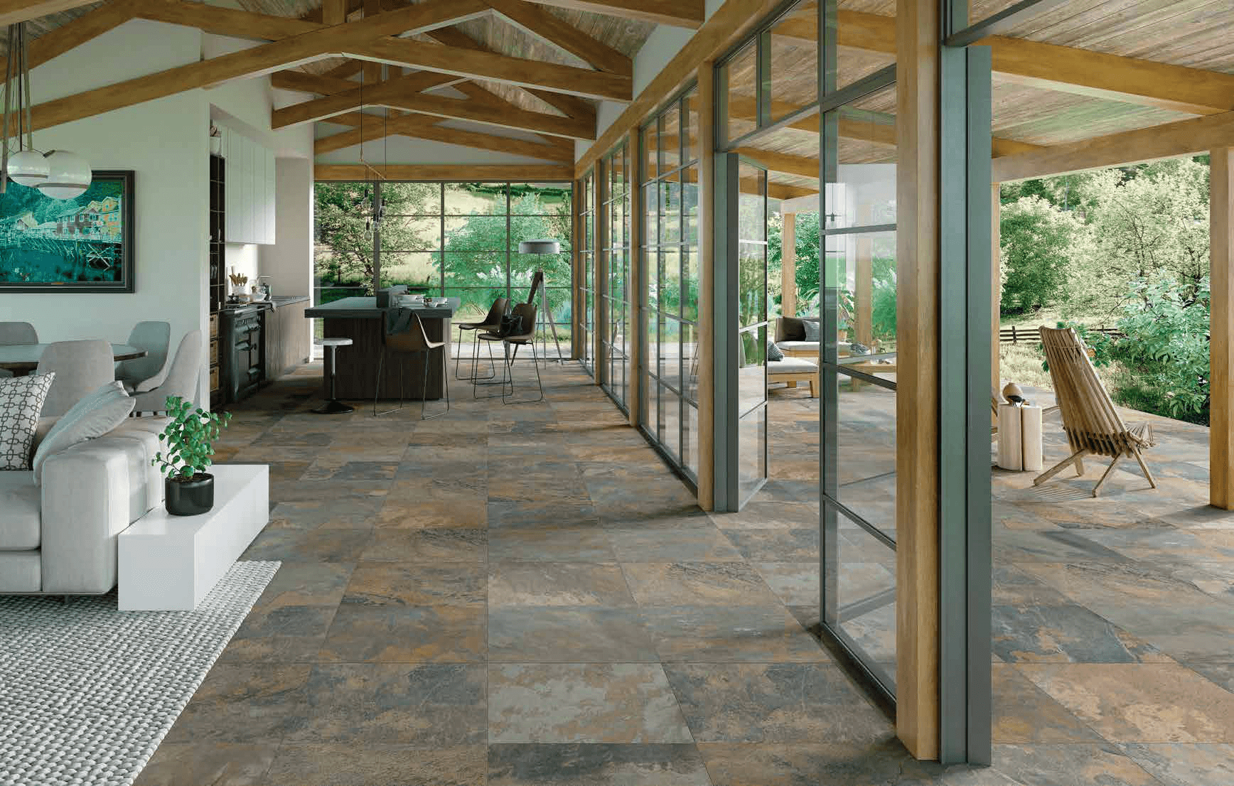 Le carrelage Polis Elements Fire reprend la texture d’une ardoise naturelle dans une teinte brun chaud qui apporte caractère et élégance. Sa finition mate crée une ambiance douce, idéale pour les pièces de vie contemporaines.