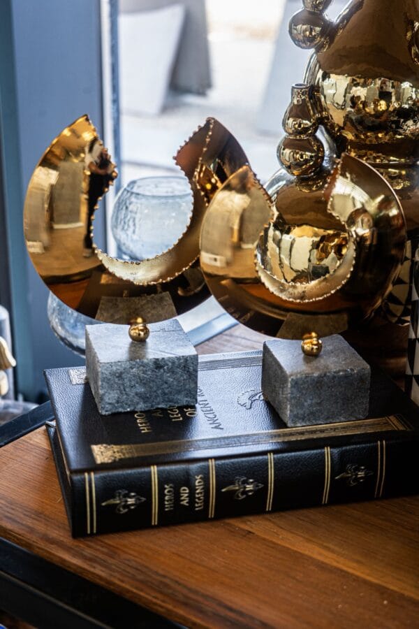 Ce lot de deux sculptures décoratives dorées est parfait pour apporter une touche moderne et luxueuse à votre intérieur. Les pièces présentent une finition métallisée brillante posée sur un socle en pierre naturelle taillée en cube, créant un contraste élégant entre minéral et métal. Elles sont idéales pour habiller une console, un bureau, une bibliothèque ou une vitrine. Leur design contemporain et sculptural attire immédiatement le regard.