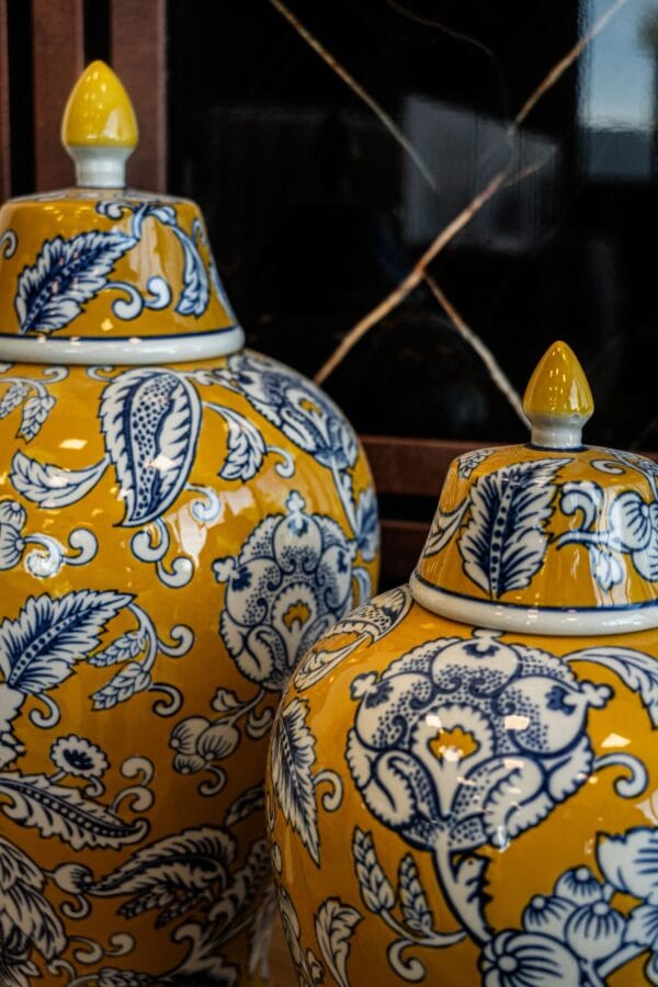 Ces vases en céramique jaune et bleu offrent une décoration élégante et expressive. Leur finition brillante et leurs motifs floraux détaillés s’inspirent du style traditionnel, tout en apportant une touche moderne grâce à leur couleur vive. Parfaits pour un buffet, une console ou un espace d’accueil, ils s’intègrent aussi bien dans une décoration classique que contemporaine. Leur présence apporte chaleur, authenticité et caractère à n’importe quelle pièce.